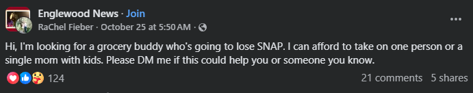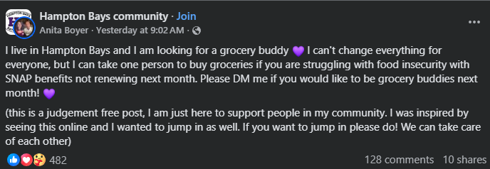 The idea is simple. People with the means volunteer to help those who may soon lose their SNAP benefits. Through neighborhood Facebook groups, online forums, and word-of-mouth, volunteers and families in need are pairing up to buy groceries, share store gift cards, or shop together.