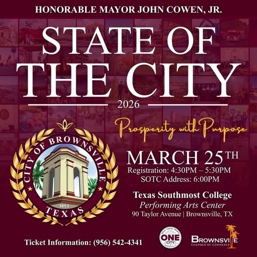 The City of Brownsville invites residents, business leaders, and community stakeholders to attend the 2026 State of the City Address, Prosperity with Purpose, presented by Mayor John Cowen Jr. on Wednesday, March 25, 2026, at the Texas Southmost College Performing Arts Center, 90 Taylor Ave.