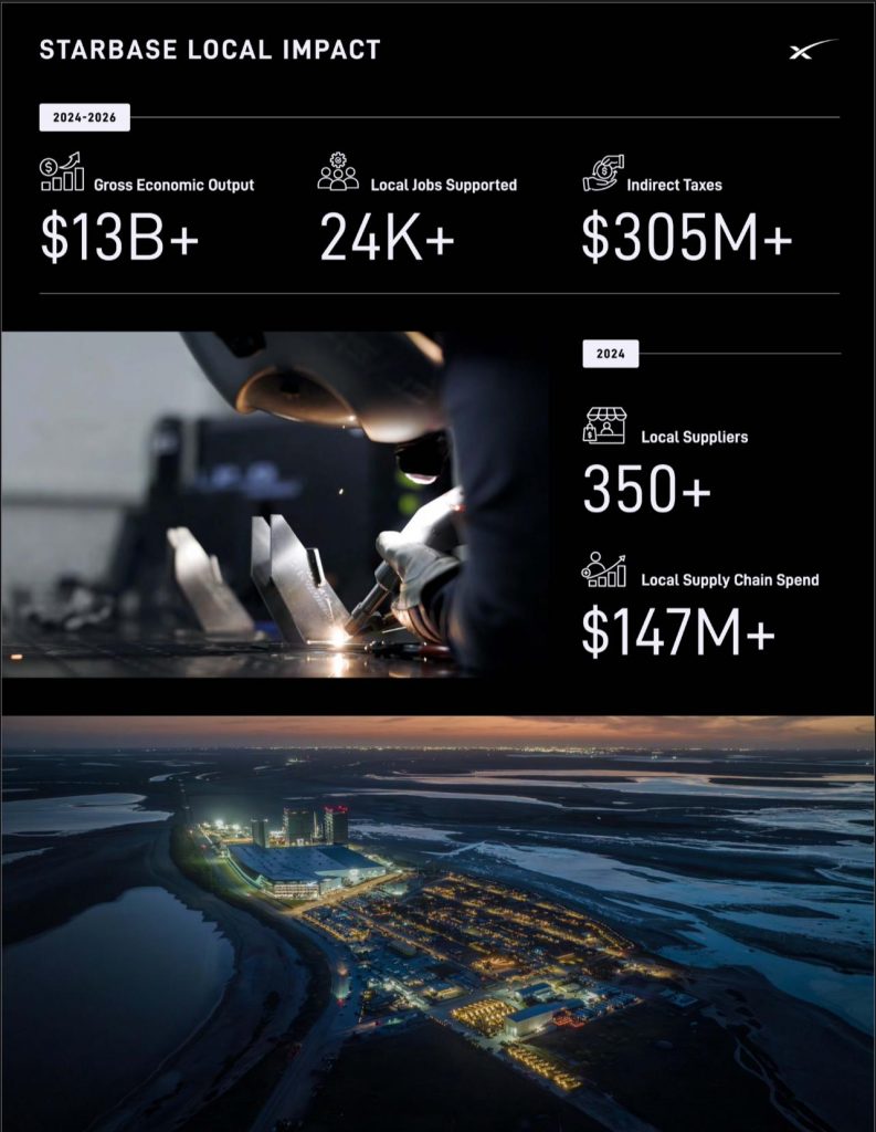 According to the 2024-2026 report, SpaceX’s activities are projected to generate more than $13 billion in gross economic output, support over 24,000 local jobs, and contribute more than $305 million in indirect taxes across Cameron County and the Rio Grande Valley.